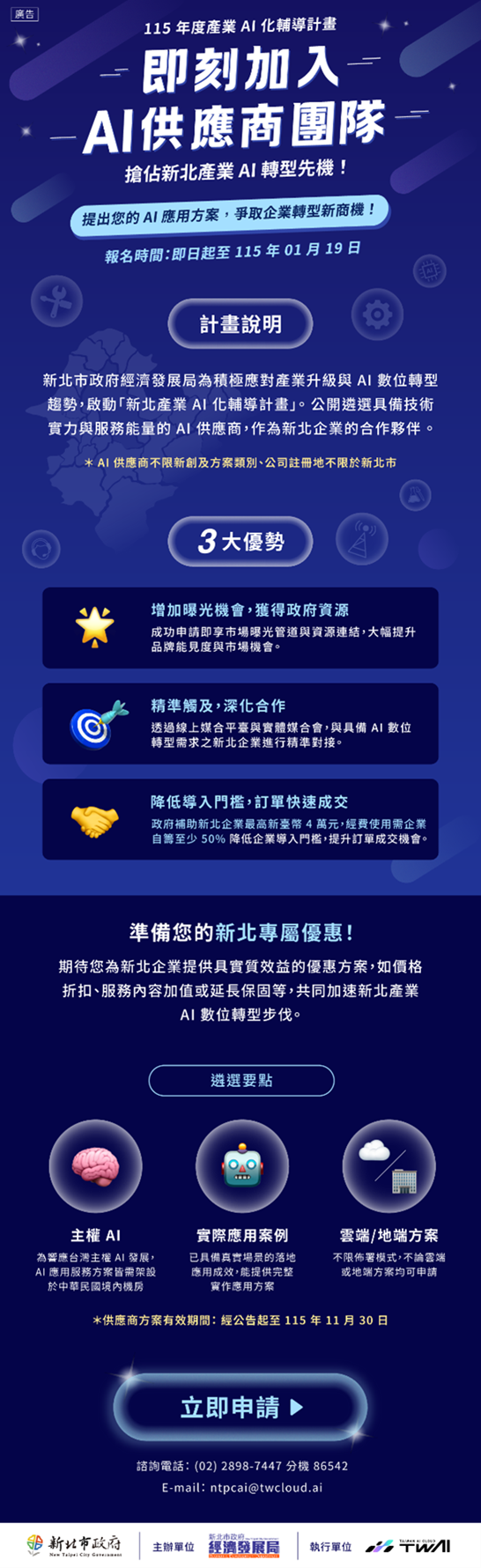 【新北市訊】因應產業升級與數位轉型趨勢,新北市政府經濟發展局推動「新北產業AI化輔導計畫」,協助企業將AI技術實際導入營運與生產流程,即日起至 1 月 19 日...