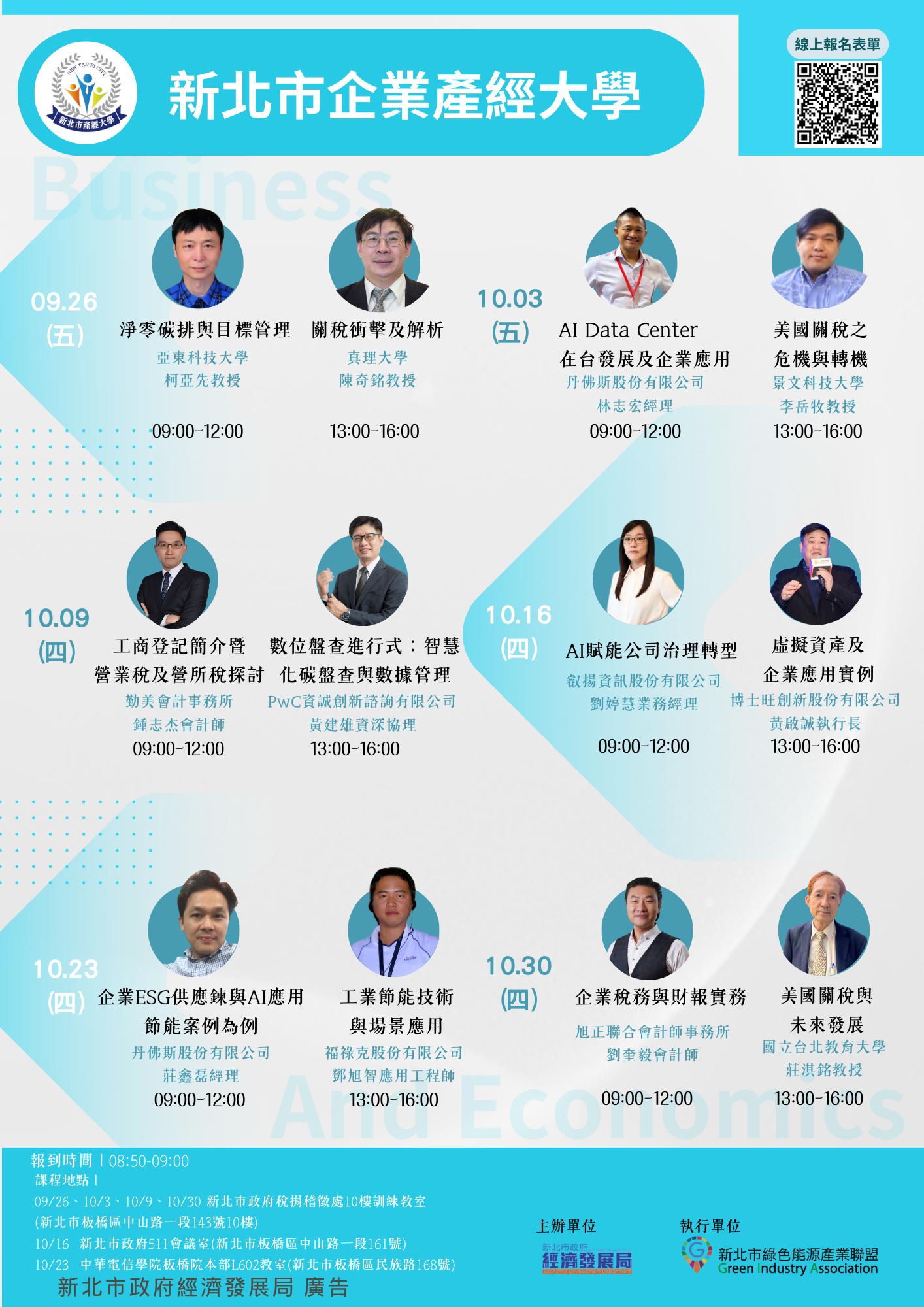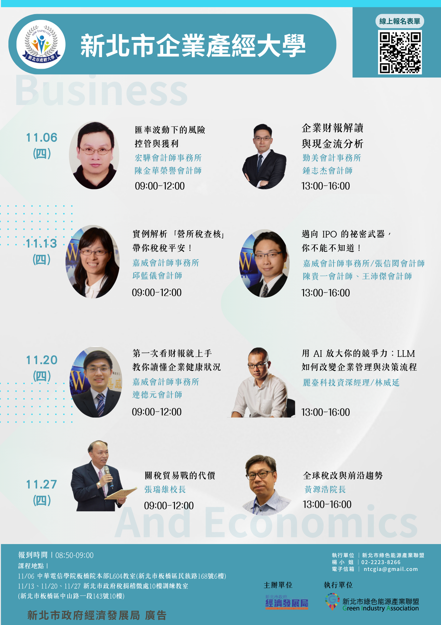 今(114)年度產經大學為響應企業持續學習需求及應對關稅影響議題,特別加開系列課程,課程內容涵蓋關稅政策解析、企業稅務、AI應用等產業發產趨勢,規劃每週6小時、共計10週之專業課程,協助新北企業快速掌握全球經濟情勢變化及擬定應對策略,進而帶動產業永續發展。